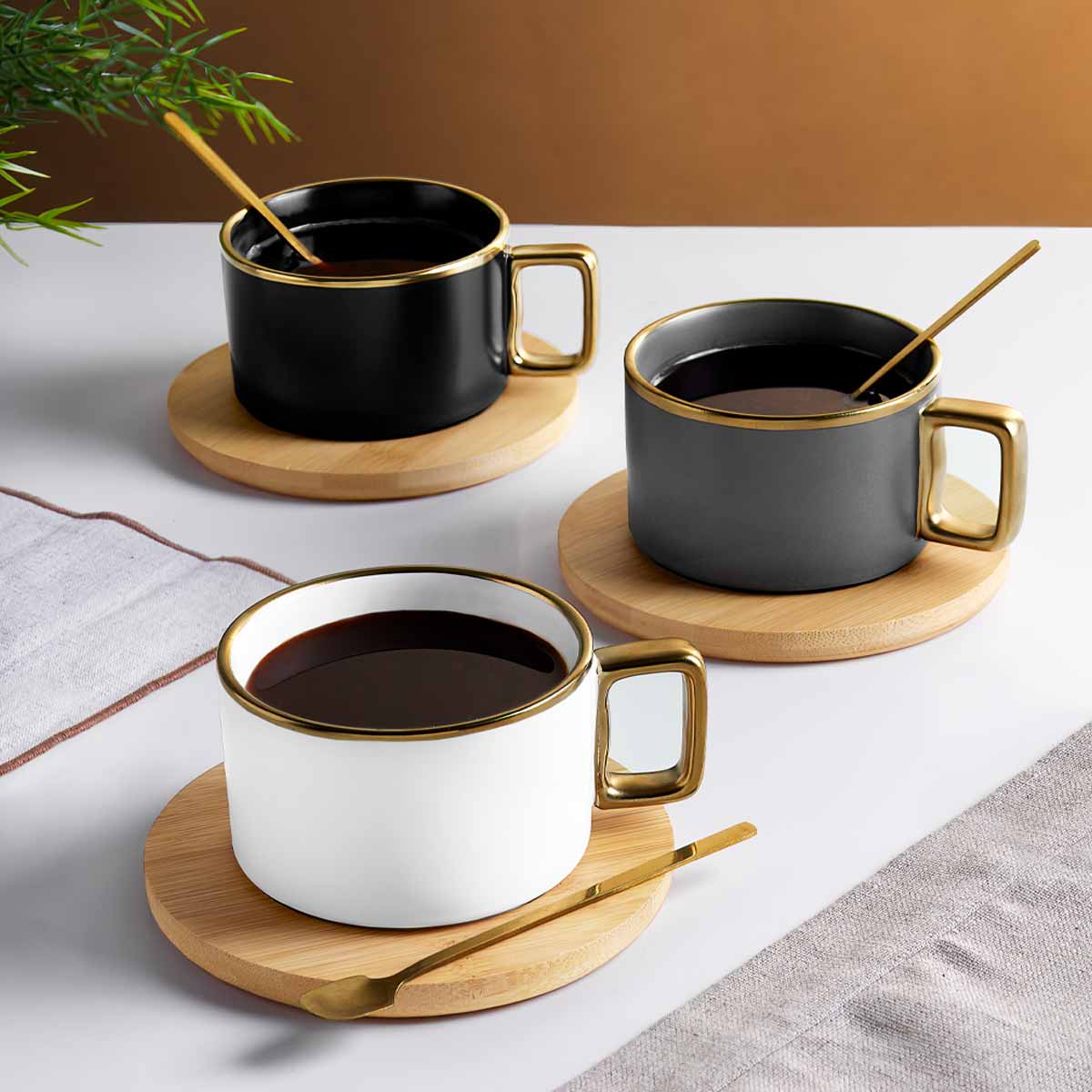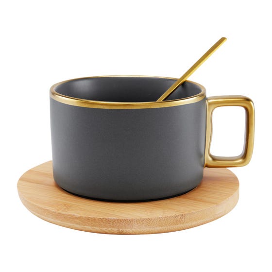 Taza de cerámica con base de bambú y cuchara metálica dorada. Terminado mate con detalle dorado en filo y asa. Incluye caja individual.